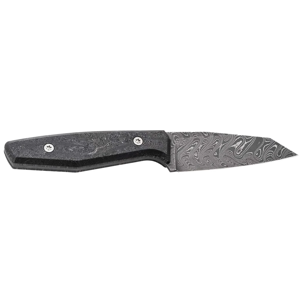 Le manche est en carbone, un matériau très convoité pour sa résistance et sa légèreté. Cette composition est exceptionnelle car elle offre une grande résistance au vieillissement et une prise en main optimale. La couleur noire du manche offre un contraste parfait avec la lame en damas.